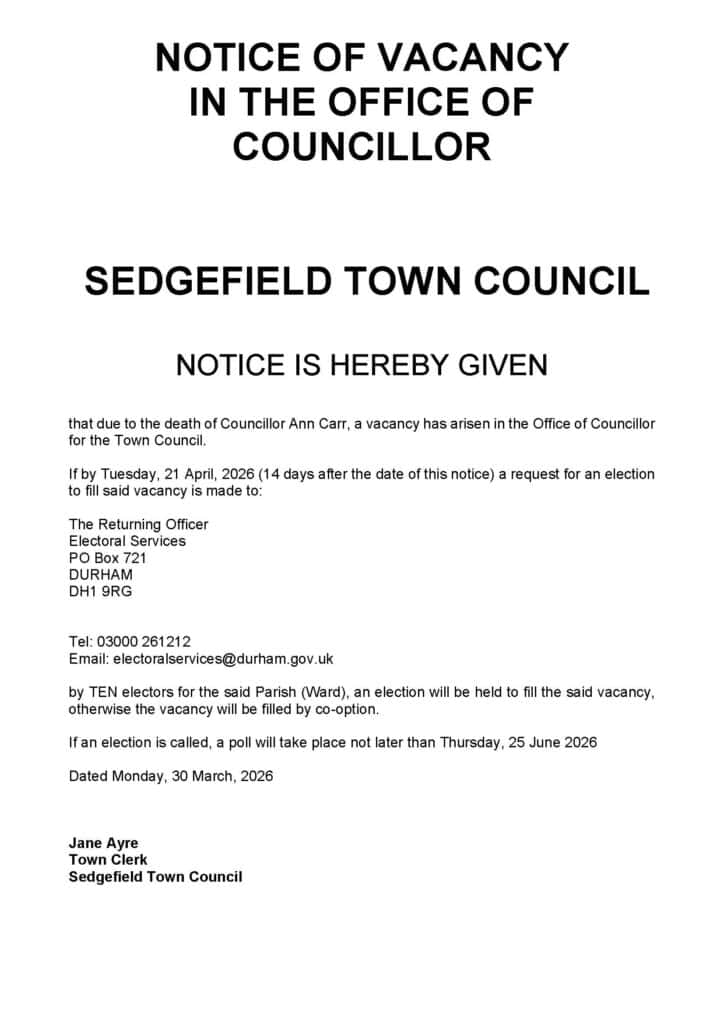 It is with a heavy heart that we must now announce a councillor vacancy. Please find below the notice issued by Durham County Council: