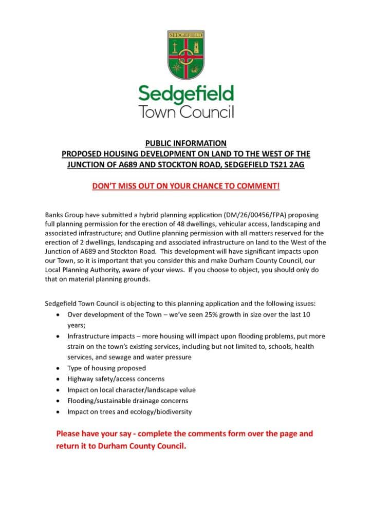 Banks Group have submitted a hybrid planning application (DM/26/00456/FPA) proposing full planning permission for the erection of 48 dwellings, vehicular access, landscaping and associated infrastructure; and Outline planning permission with all matters reserved for the erection of 2 dwellings, landscaping and associated infrastructure on land to the West of the Junction of A689 and Stockton Road. This development will have significant impacts upon our Town, so it is important that you consider this and make Durham County Council, our Local Planning Authority, aware of your views. If you choose to object, you should only do that on material planning grounds.