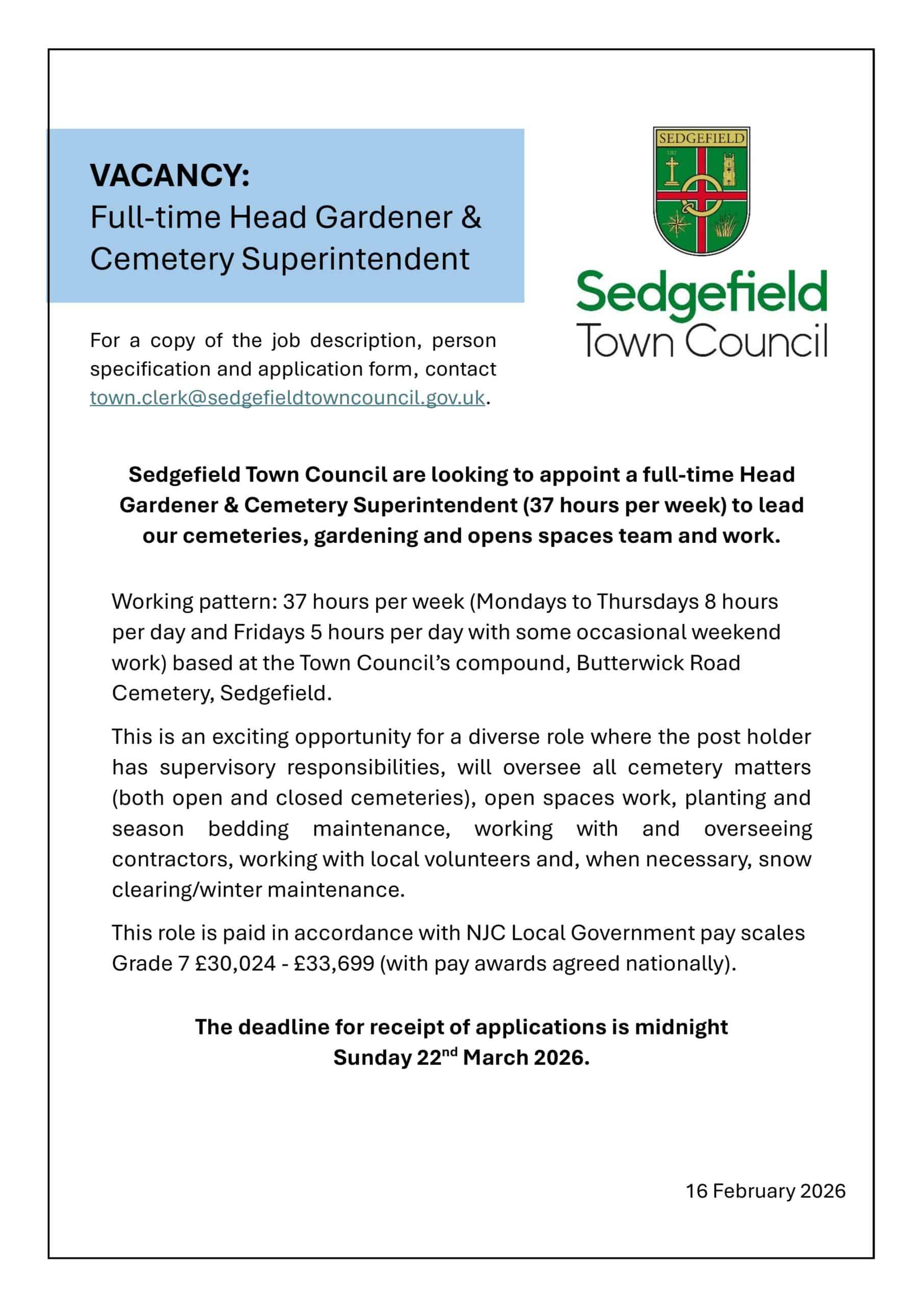 For a copy of the job description, person specification and application form, email town.clerk@sedgefieldtowncouncil.gov.uk.