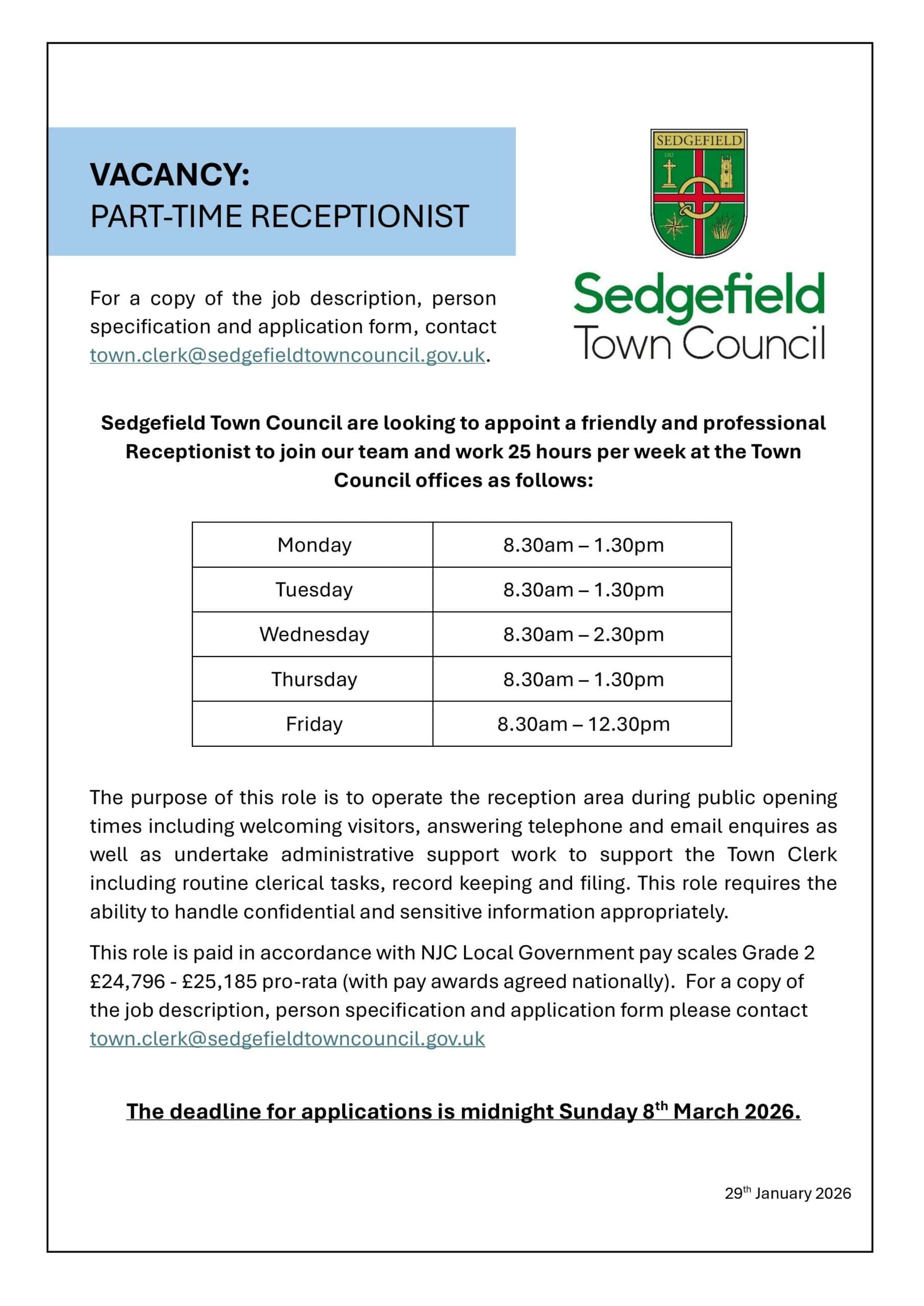 Sedgefield Town Council are looking to appoint a friendly and professional Receptionist to join our team and work 25 hours per week at the Town Council offices as follows: